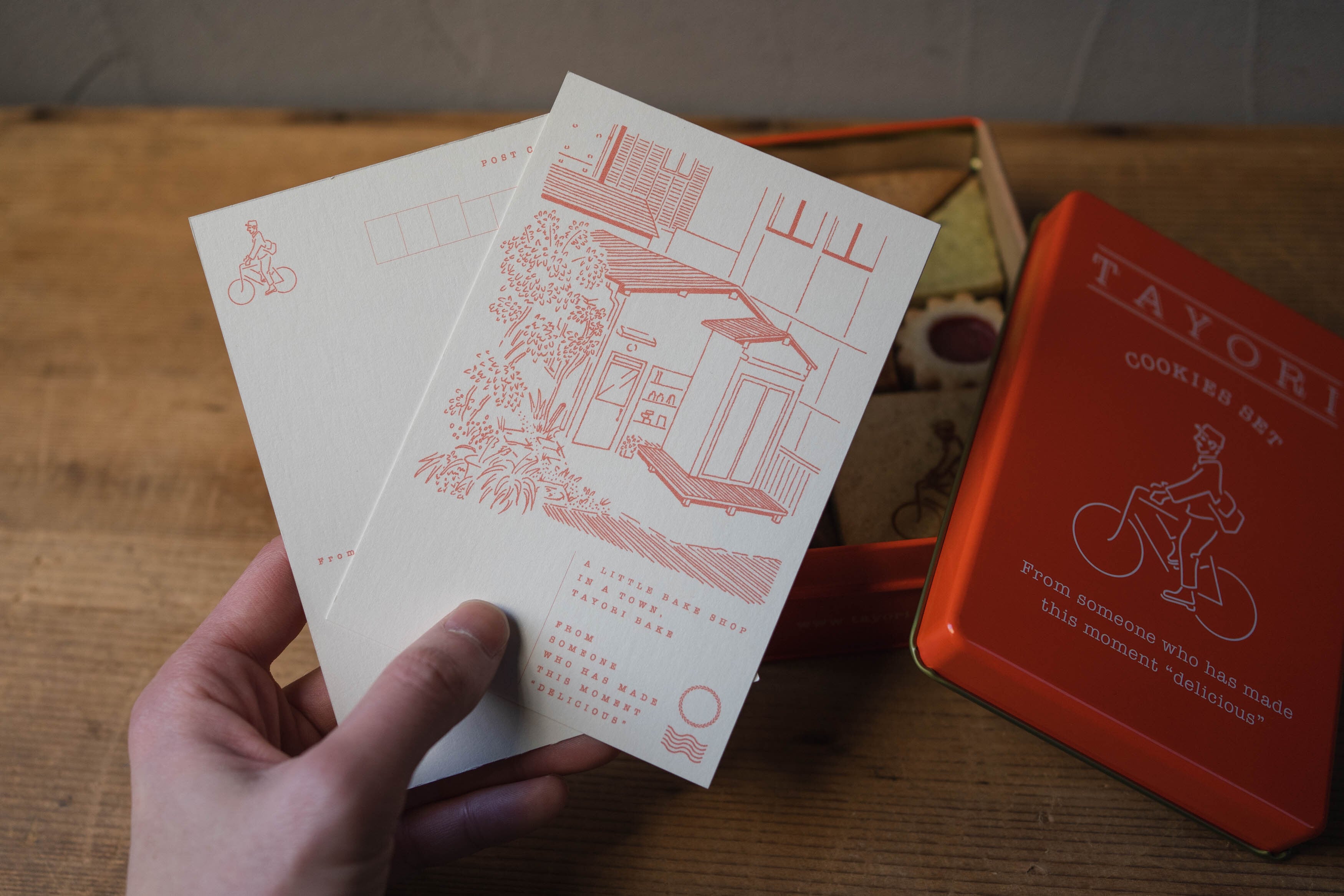 2026年1月より、クッキーの内容をリニューアルしました。 その日の気分にそっと寄り添ってくれる、小さなおやつ。「日和」という名には、そんな思いを込めています。 全粒粉、豆乳バニラ、塩ショコラなど素朴でやさしい味わいに、チャイ、ラムレーズンヘーゼルナッツ、アニスココア、玄米茶と柚子など、個性豊かな香りが広がるフレーバーを詰め合わせた全8種類のクッキー缶です。 生地作り、型抜き、焼成、詰め合わせまですべての工程をひとつひとつ手作業で行っています。 TAYORIおじさんの焼印は、1枚ずつ表情を確かめるようにそっと押しています。 郵便ポストから着想を得た朱色の缶には、TAYORIのロゴにもなっている、手紙を届ける「TAYORIおじさん」をあしらいました。食べ終わった後もポストカードなどを仕舞えるよう、手紙箱のようなサイズに仕立てました。
